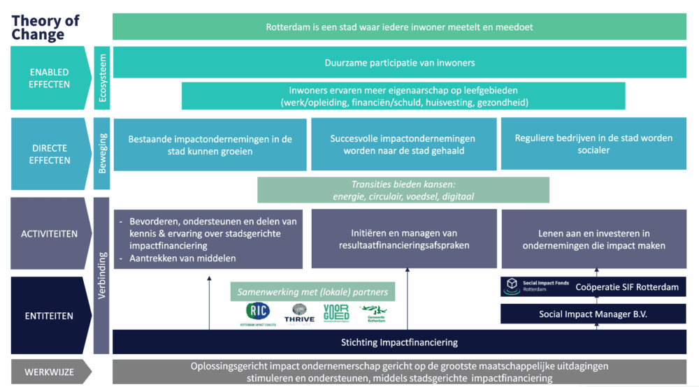 Onze investeringsstrategie gaat hand in hand met onze verandertheorie. Dit impactmodel is opgesteld in samenwerking met Impact House by Grant Thornton en Impact Centre Erasmus (ICE). Aan de hand van deze kaders toetst SIF Rotterdam haar werk en investeringen.