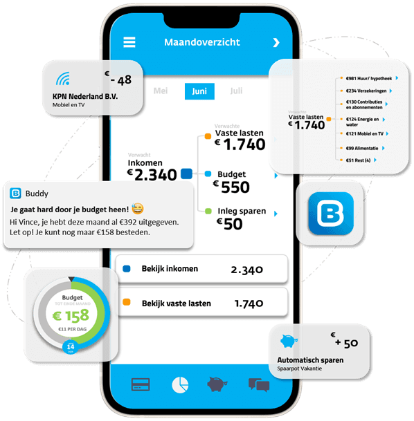De Buddy App is een efficiënte oplossing voor mensen met schulden, schuldhulpverleners én mensen die schulden willen voorkomen! De Buddy App verschaft niet alleen inzicht in je persoonlijke financiële situatie op basis van algoritmes, maar voert ook ontzorgende handelingen uit en geeft tips voor het verbeteren van de financiële situatie